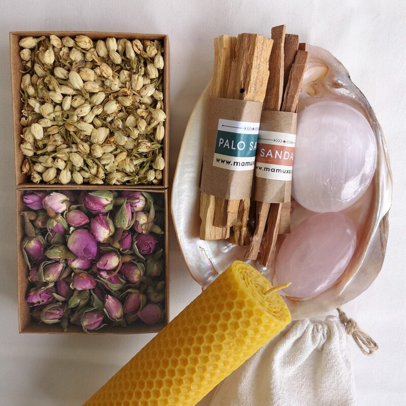 • Includes: Sandalwood, Palo Santo, Rose Quartz, Selenite, Makabe Sea Shell, Beeswax Candle, Rose & Jasmine Flowers